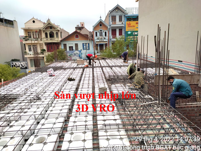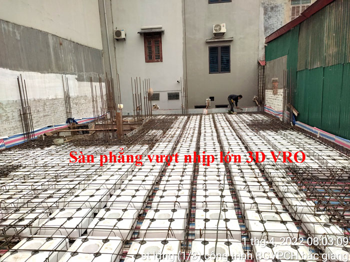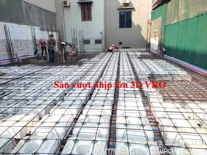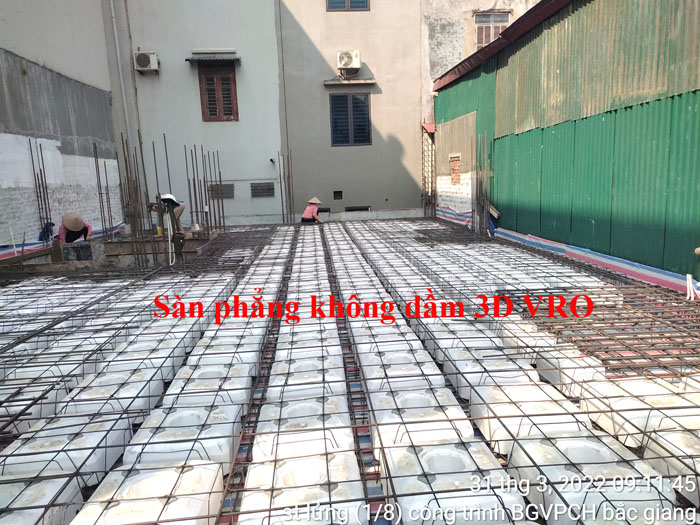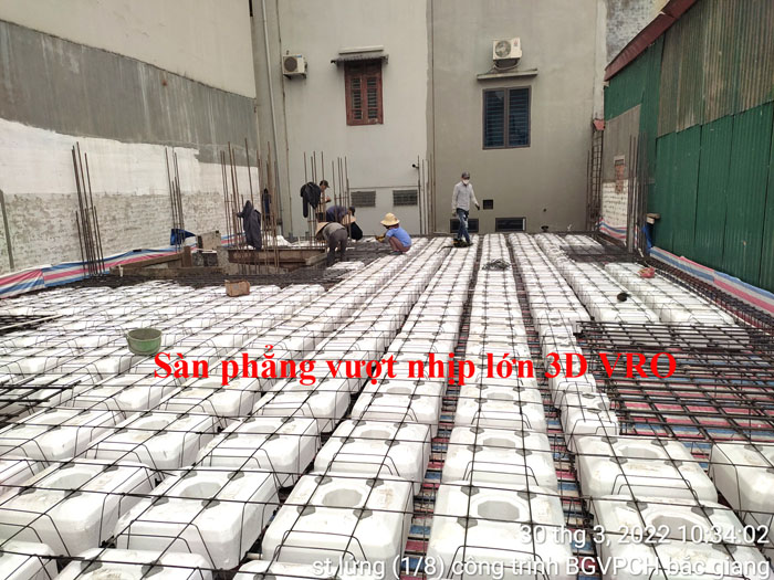 Sàn phẳng, sàn nhịp lớn, sàn phẳng vượt nhịp lớn, sàn không dầm, sàn phẳng không dầm vượt nhịp lớn, sàn vượt nhịp lớn, cách âm, cách nhiệt, thi công nhanh 3D VRO-Thi công sàn tầng 3 văn phòng công ty Mai Hương, Bắc Giang.