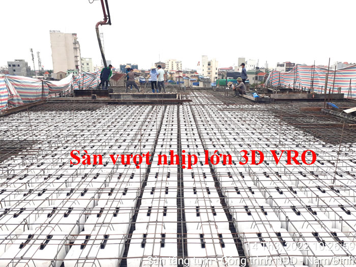 Sàn nhịp lớn, sàn vượt nhịp lớn, Sàn phẳng, sàn phẳng không dầm, sàn phẳng vượt nhịp lớn 3D VRO - Thi công sàn tầng 5 TTTM Vĩnh Ninh, Nam Định. (Diện tích 1 sàn 400m2 x 5 sàn ).